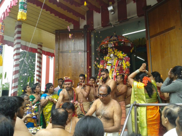 Nun wird der Wagen in Bewegung gesetzt. An zwei Seilen ziehen rechts die Frauen, links die Männer das Göttergefährt durch die Straßen. Musikanten mit Trommeln und Blechblasinstrumenten führen den Prozessionszug an, gefolgt von Tänzern, die auf ihren Schultern schwere Hozbögen tragen. Diese sind mit Pfauenfedern, Blumen und Ketten geschmückt. Einige Frauen tragen Silbertöpfe mit Kokosmilch oder Messingschalen mit einer Flamme auf dem Kopf als Ausdruck des Dankes an ihren Gott. Nach hinduistischer Tradition wird der Götterwagen im Uhrzeigersinn einmal um den Tempel herum gefahren, also in Britz von der Blaschkoallee in den Britzer Damm, von hier durch die Hannemannstraße über die Riesestraße wieder zurück zum Ausgangspunkt. An jeder Straßenecke macht der Wagen halt, wo die Besuchenden die Möglichkeit haben, sich an Ständen mit geweihten kulinarischen Köstlichkeiten (Prasad) sich zu stärken und einen Segen mit nach Hause zu nehmen.