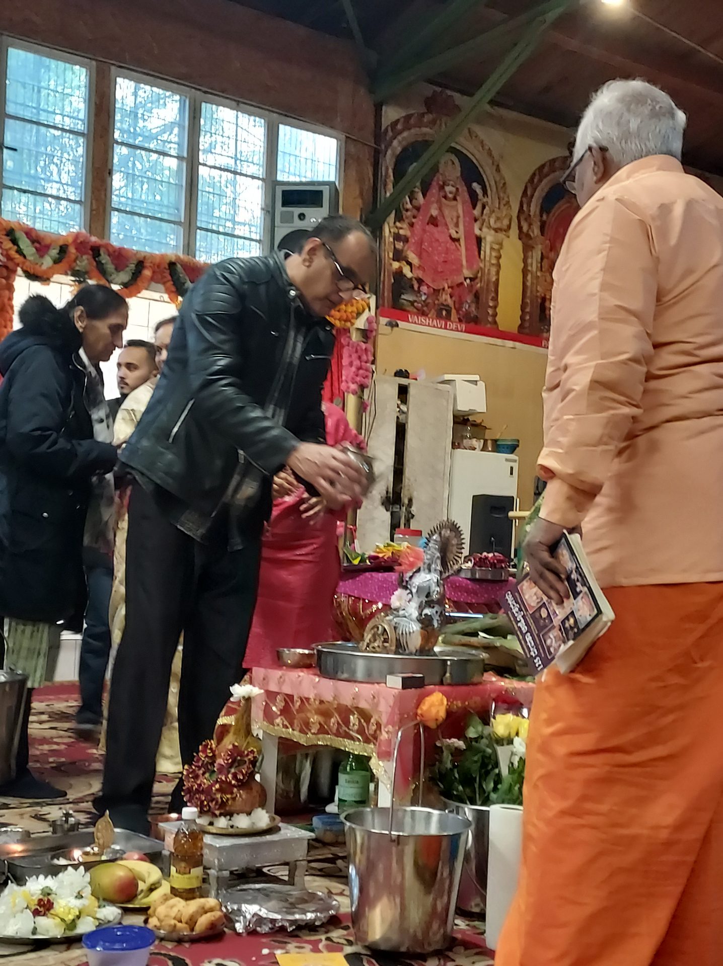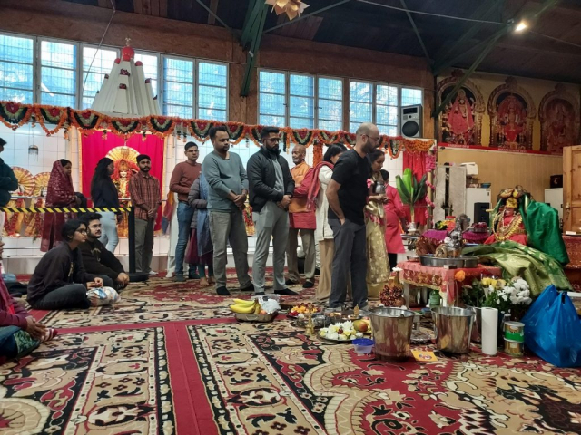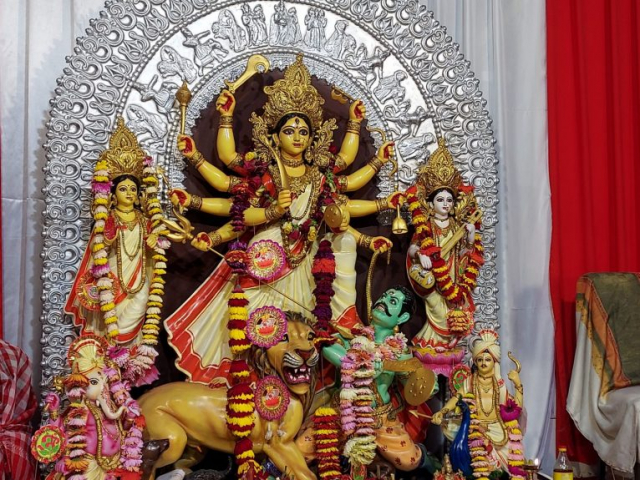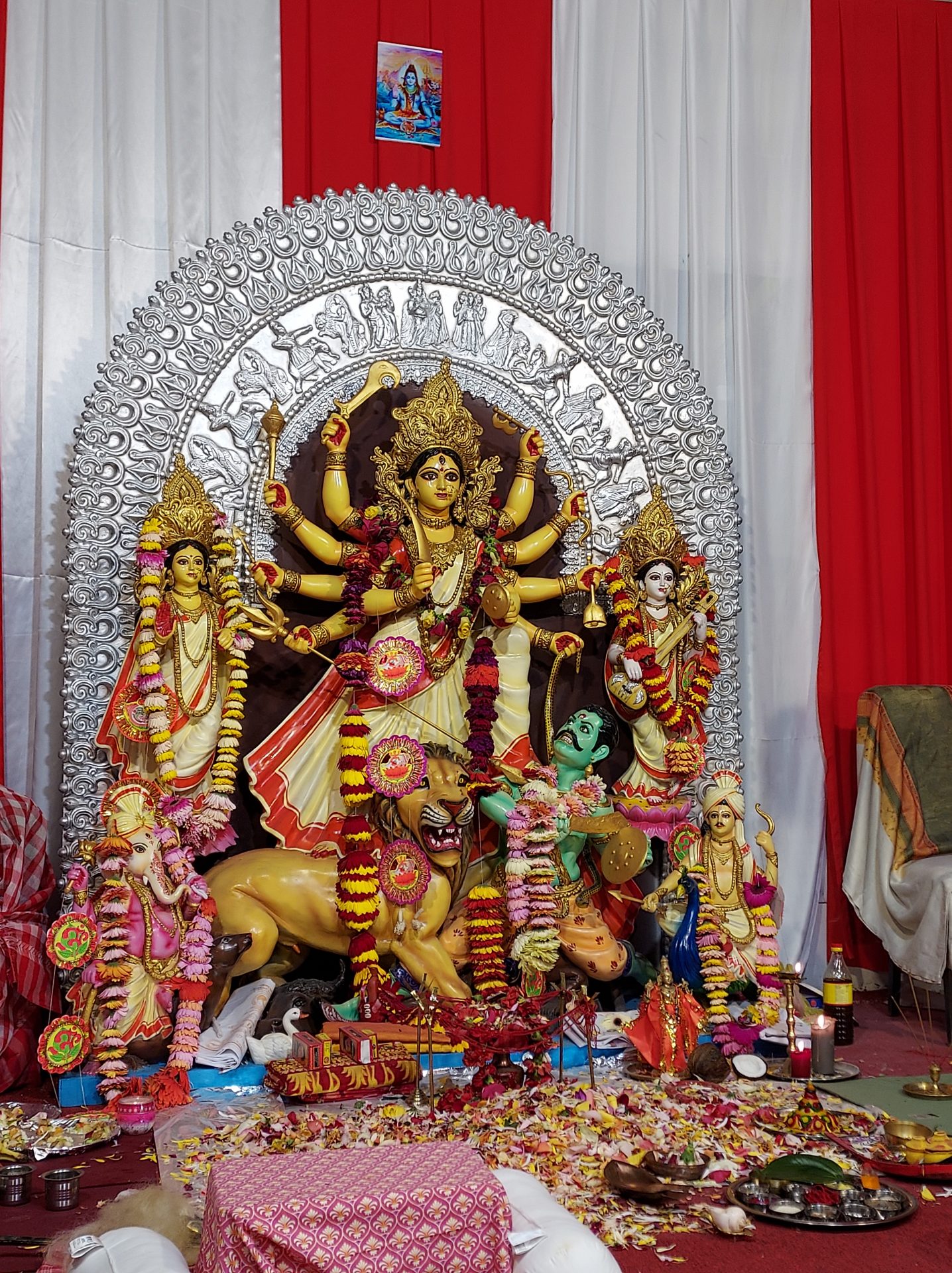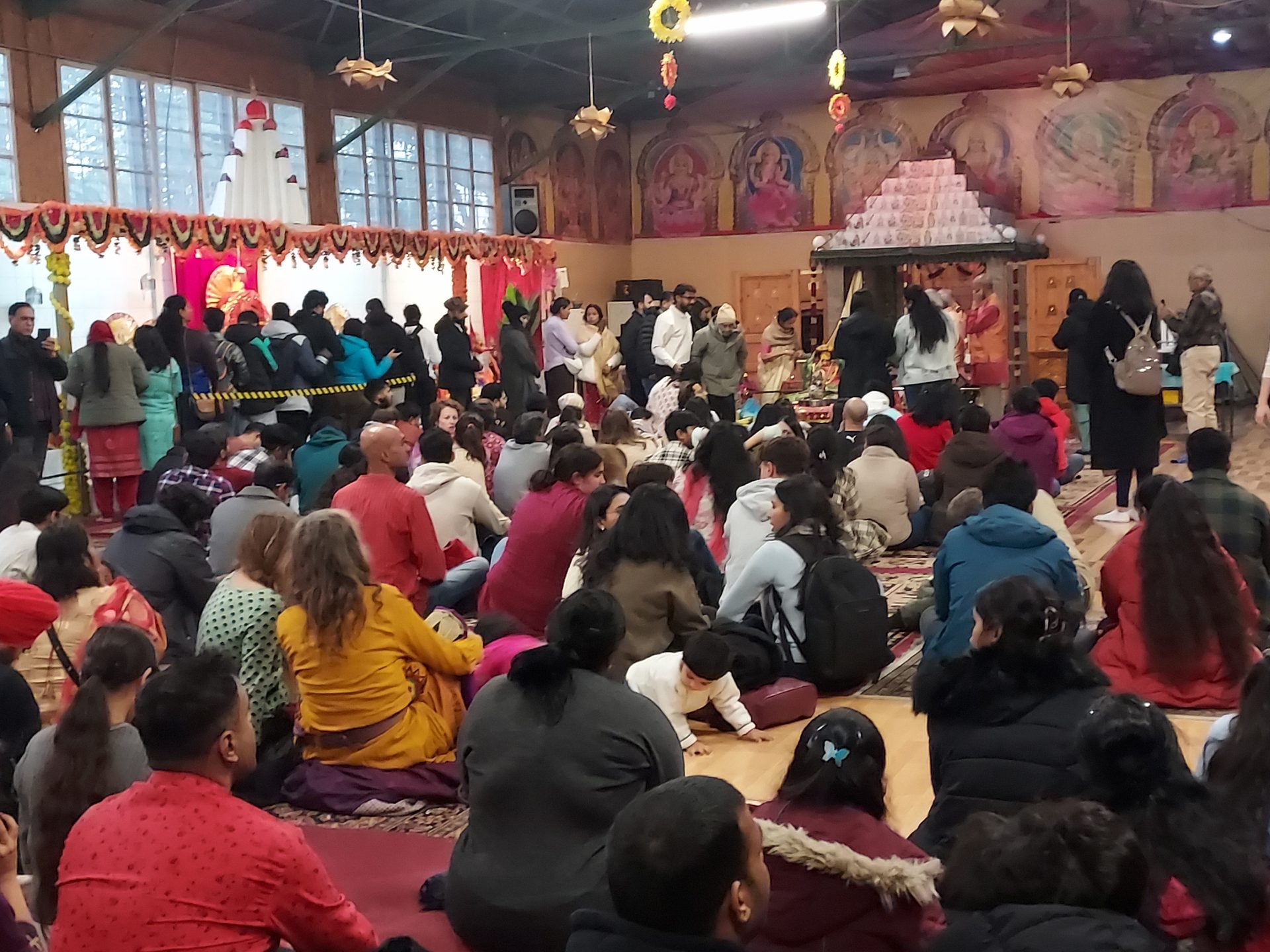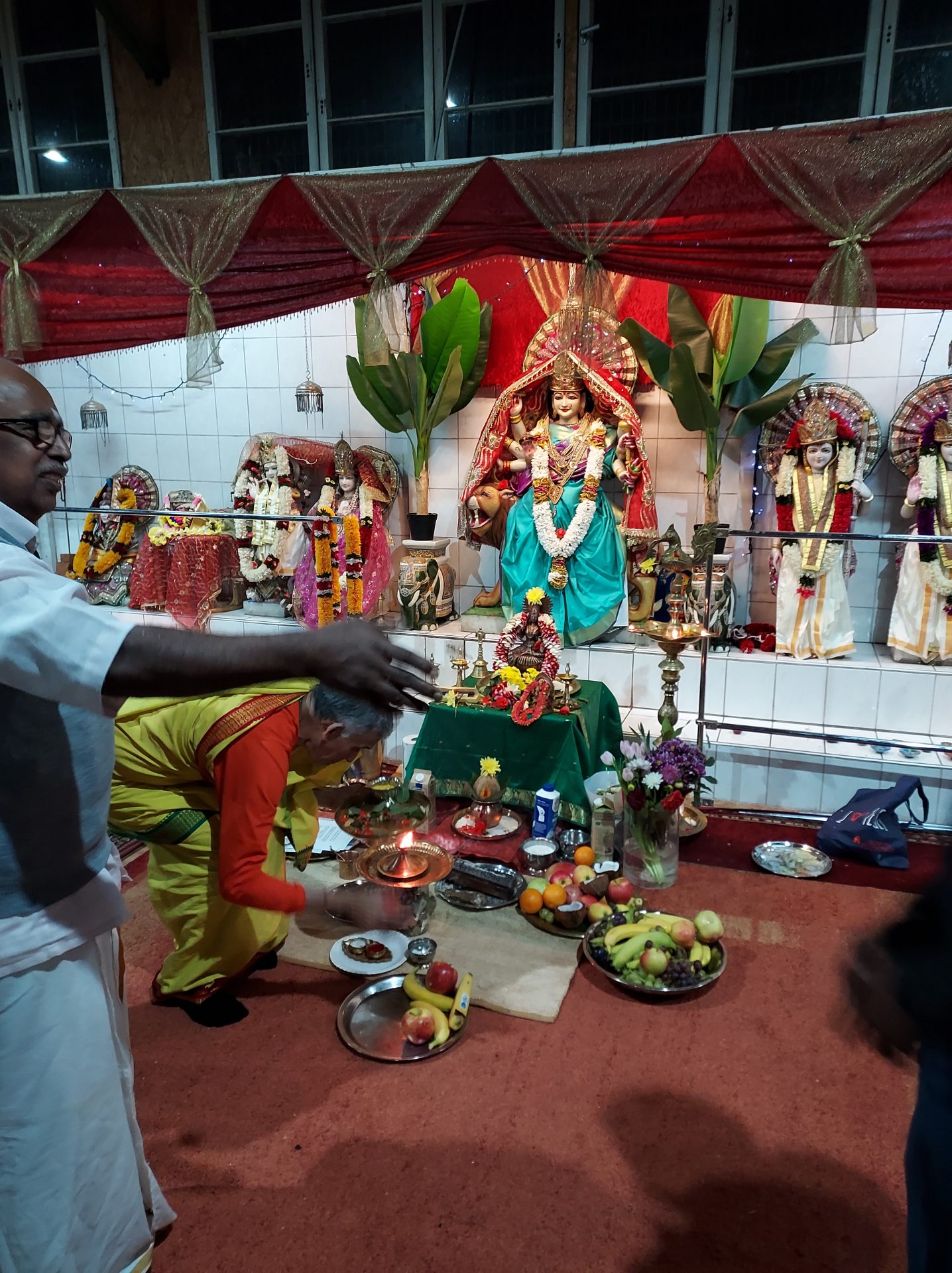 Heute, am 9. Tag herrscht reges Treiben. Bereits vor dem Eingang des Tempels lladen Stände mit indischen Spezialitäten wie Masala Dosa, Samosas und Pakoras zum Schlemmen ein. In der großen Tempelhalle platzieren bengalische Frauen Früchte, Blumen und Reis vor dem Durgabild, während ein Priester Verse aus der Heiligen Schrift: Dev Mahatmyam rezitiert. Inmitten des Raumes sitzen Kinder im Kreis und stopfen sich lachend süße, ölige Gebäckstücke in den Mund. Daneben segnet ein Tempelmitglied einige Gläubige, die sich betend niederwerfen. Als gegen 20:00 Uhr das Musikprogramm mit traditionellen indischen Tänzen, klassischer Tamilmusik und Bollywood-Hits aufgeführt wird, steigt die Stimmung und die Gäste klatschen laut und singen mit. Am Ende posieren zahlreiche Familien vor der Statue, machen Fotos und verzehren Prasad – süße Gebäckstücke, die Durga zuvor geweiht wurden. So tragen sie die Erinnerung an das Fest und den Segen der Göttin mit nach Hause.