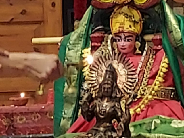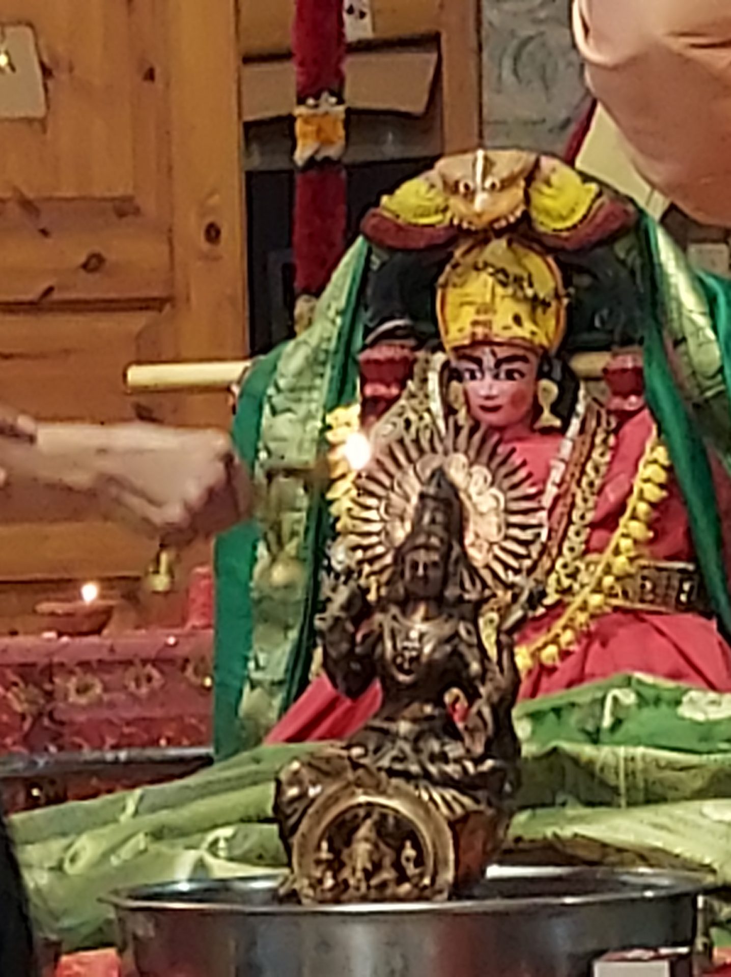 Da der Priester krank ist, springt heute das Tempelkomitee ein. Einige Frauen und Männer sind noch dabei, die rituellen Utensilien zusammenzustellen. Nun läutet ein Tempelmitglied die Glocke und die Zeremonie beginnt: Während Herr K. aus einem Buch Mantren in der uralten Sanskrit-Sprache rezitiert, lässt Frau G. aus einer silbernen Kanne langsam goldgelbe Safranmilch über die Statue der Göttin fließen.